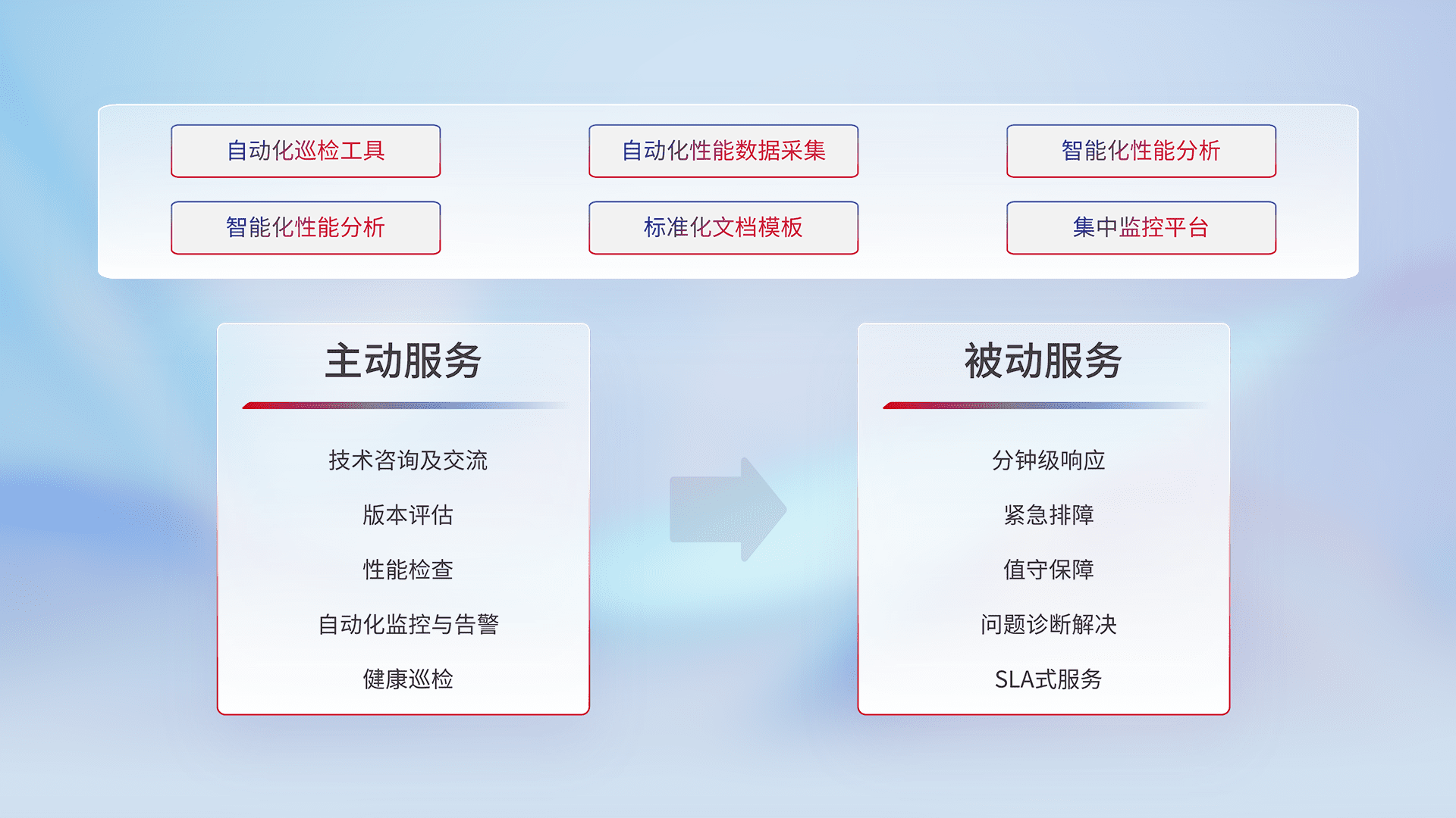 智能化工具和标准化文档,,,保障服务质量,,,提供主动服务(包含技术咨询、、、、版本评估、、、、性能检查、、自动化监控与告警、、、、健康巡检)和被动服务包含(分钟级响应、、、紧急排障、、、值守保障、、、、问题诊断解决、、、SLA服务)。。。